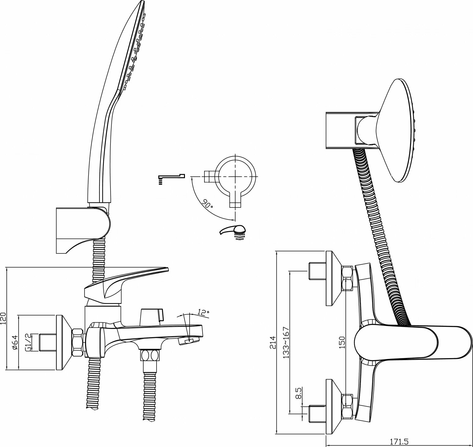 | Комплектация | Смеситель / шланг 1,5 м / настенное поворотное крепление для лейки / 3-функциональная лейка / присоединительная группа для вертикального крепления |