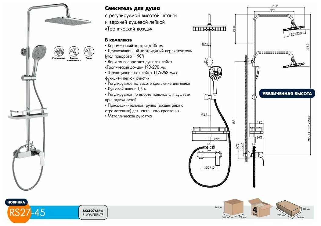Смеситель Rossinka RS27-45 для душа с регулируемой высотой штанги и лейкой "Тропический дождь"