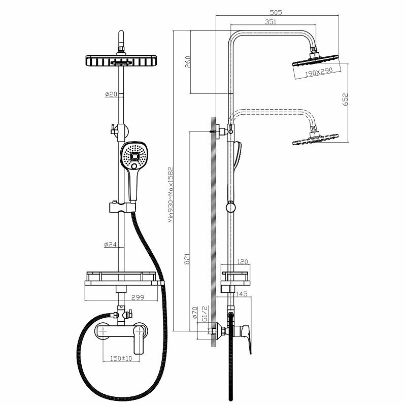 | Особенности | S-образные эксцентрики / держатель душевой лейки / регулируемый верхний душ |