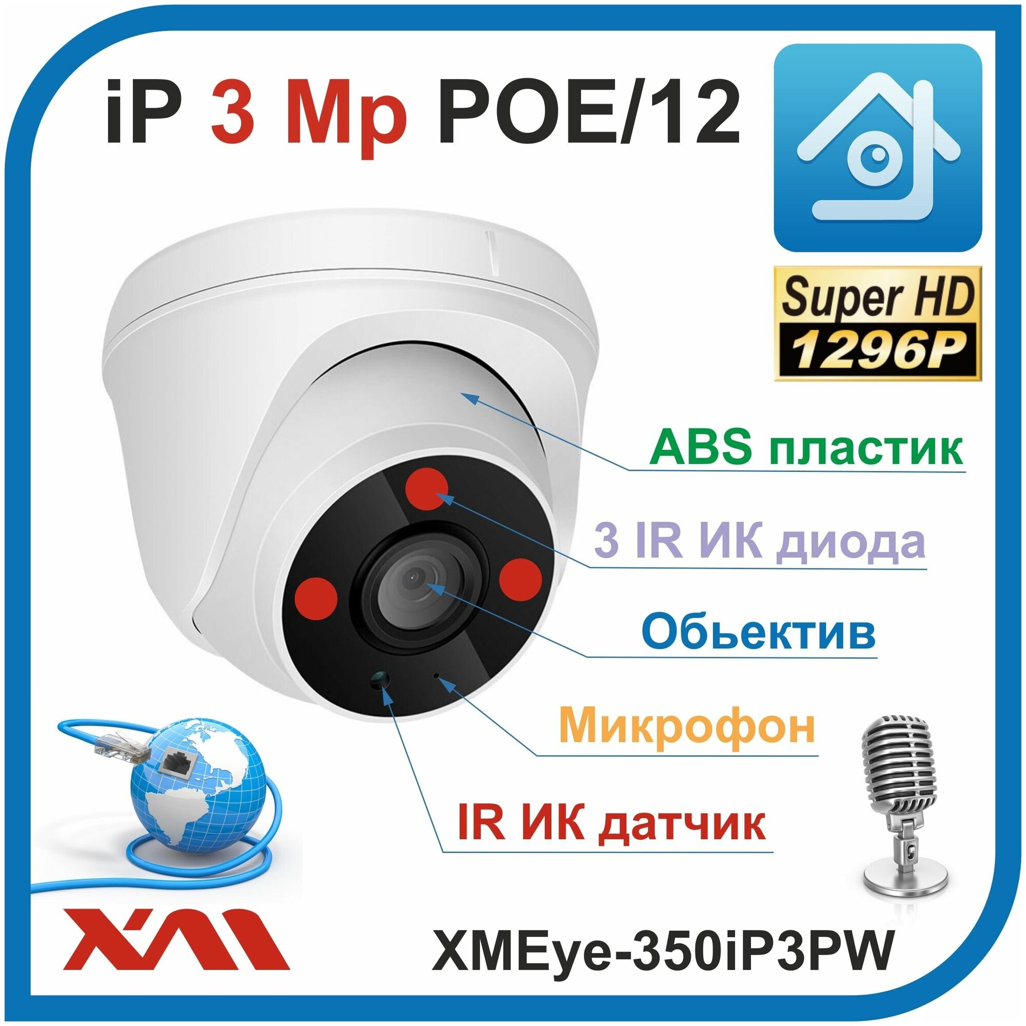 Камера видеонаблюдения купольная с микрофоном IP, 3Mpx, 1296P, XMEye-350iP3PW-2.8. POE/12 (Пластик/Белая) интересное: