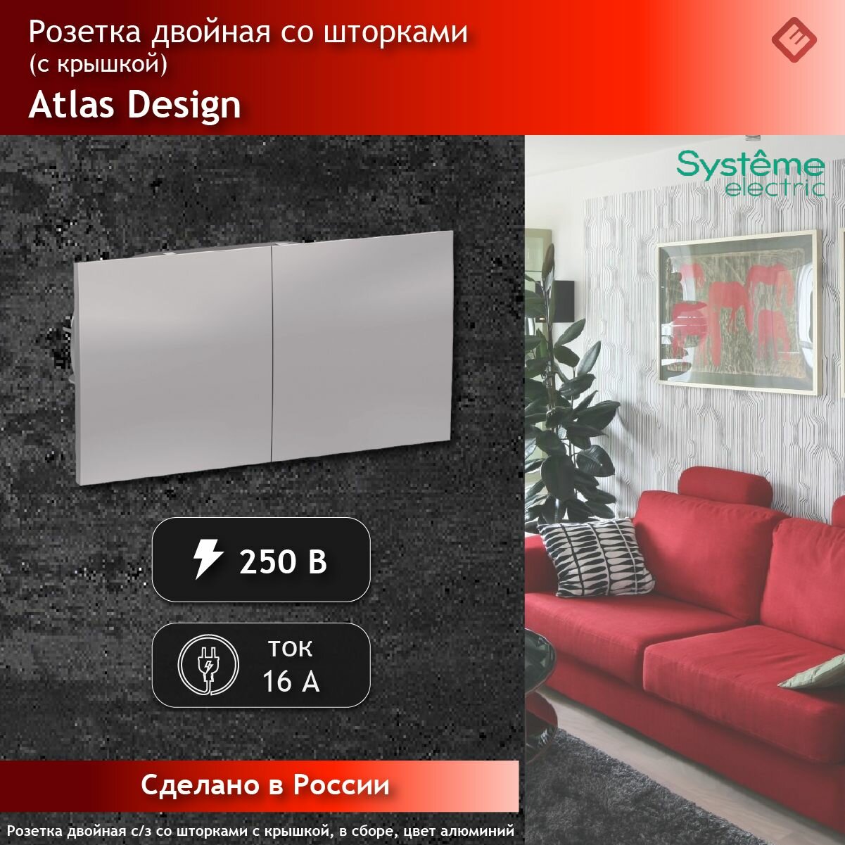 Розетка 1-м СП AtlasDesign 16А IP20 с заземл. защ. шторки механизм красн. | код ATN002045 | Schneider Electric (5шт. в упак.)