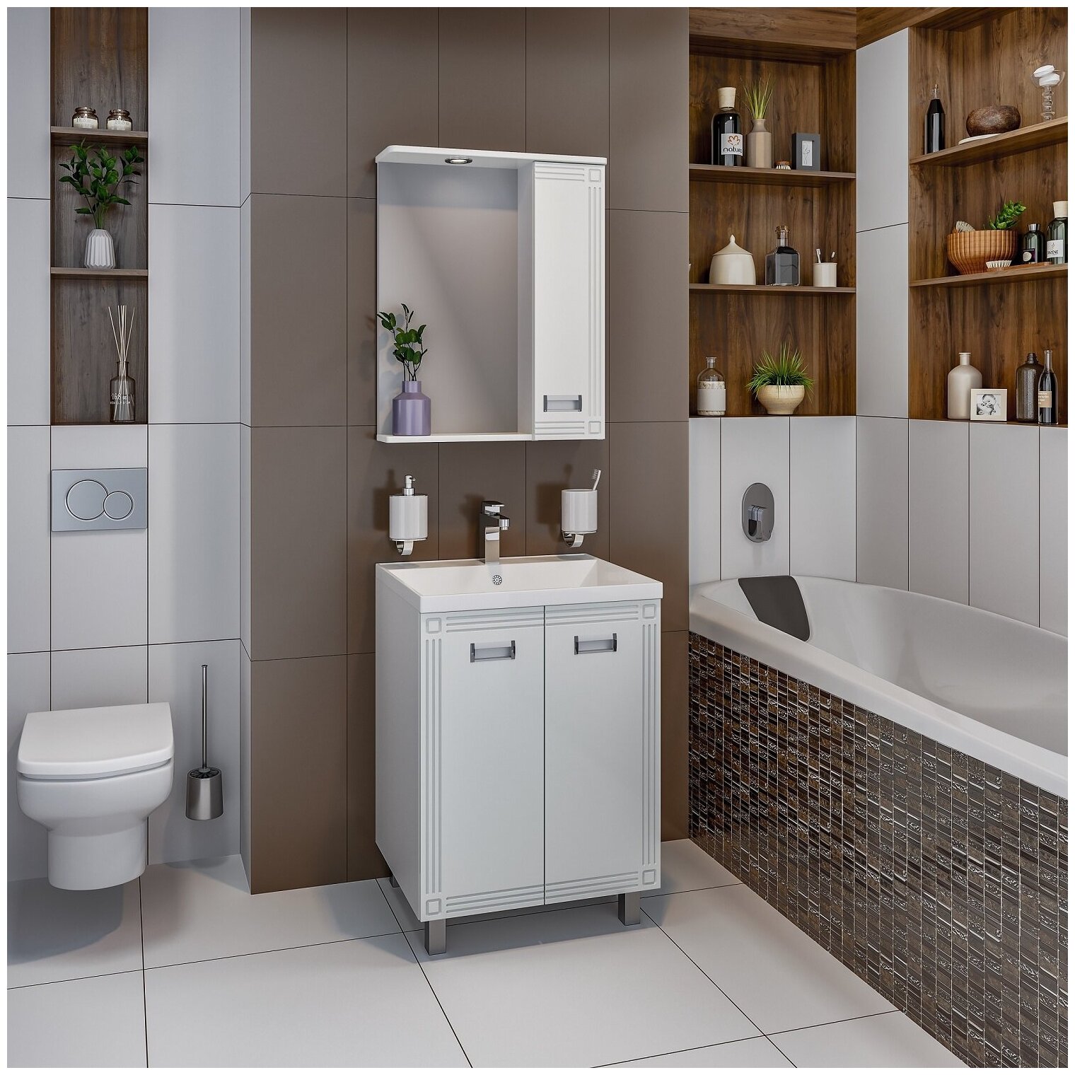| Комплектация | 1 тумба под раковину, 1 шкаф-зеркало, 1 умывальник Стиль 75, 2 навеса, 1 светодиодный светильник, 1 розетка с выключателем, 2 ручки, 4 ножки. |