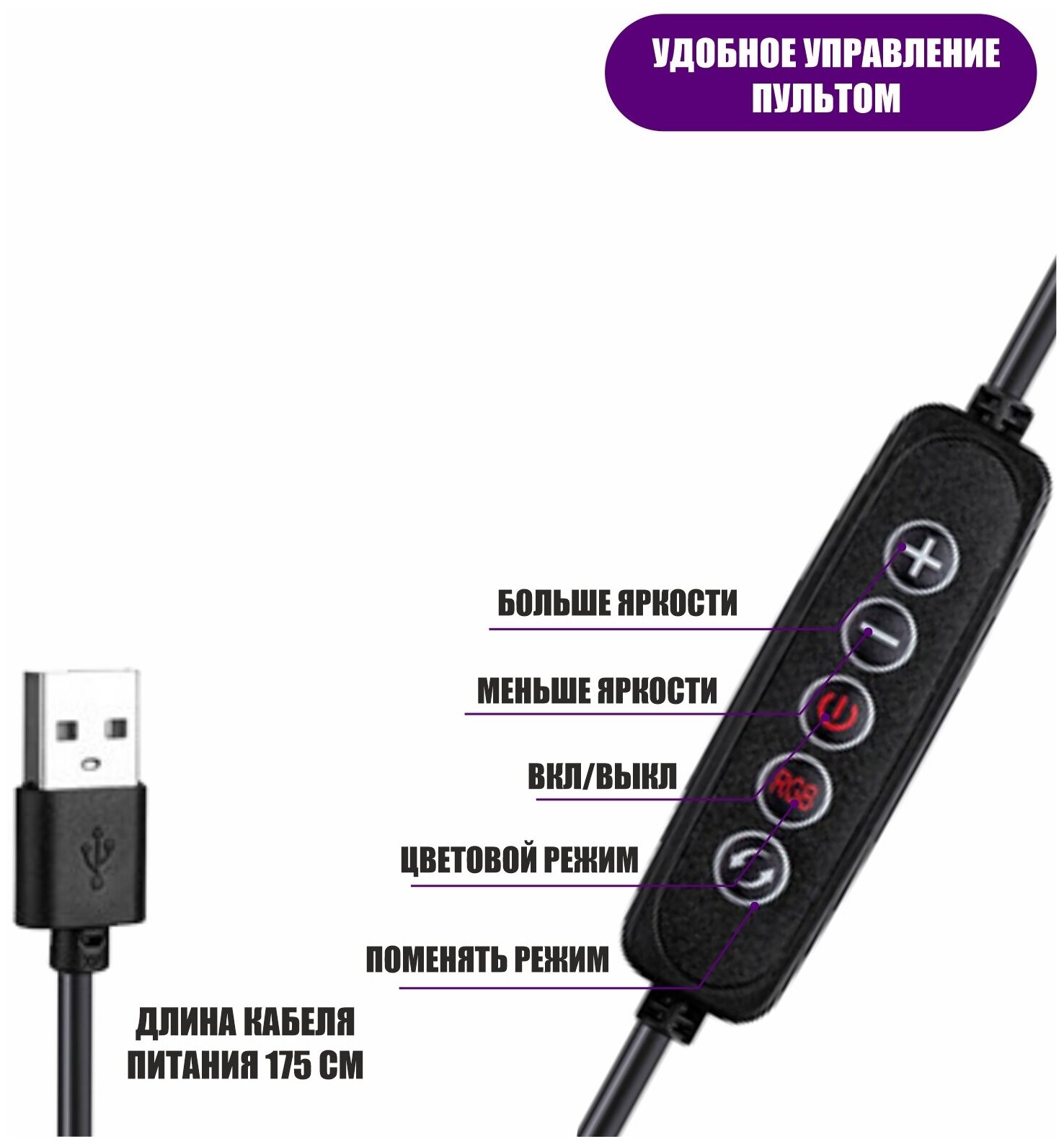 | Плюсы: | Во-первых всё отлично работает так как ожидали и даже лучше: регулируется яркость на несколько уровней (больше трёх!), меняется свет: теплый, холодный, нейтральный; меняется цвет: голубой, фиолетовый, зеленый, желтый, красный, есть режим динамического изменения цветов: карусель цветов с вращением.