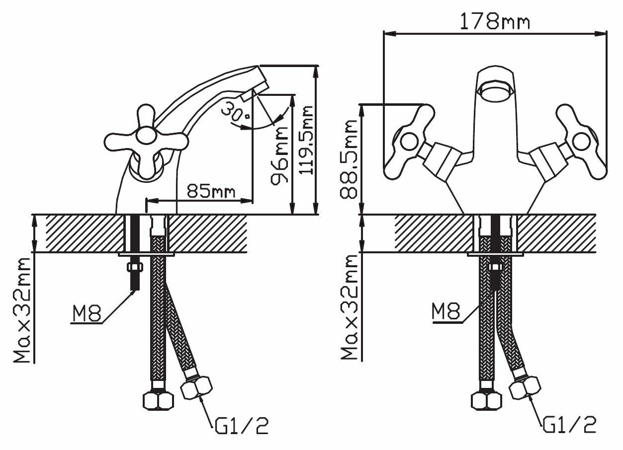 | Комплектация | смеситель, гибкая подводка 35 см - 2 шт, крепление |