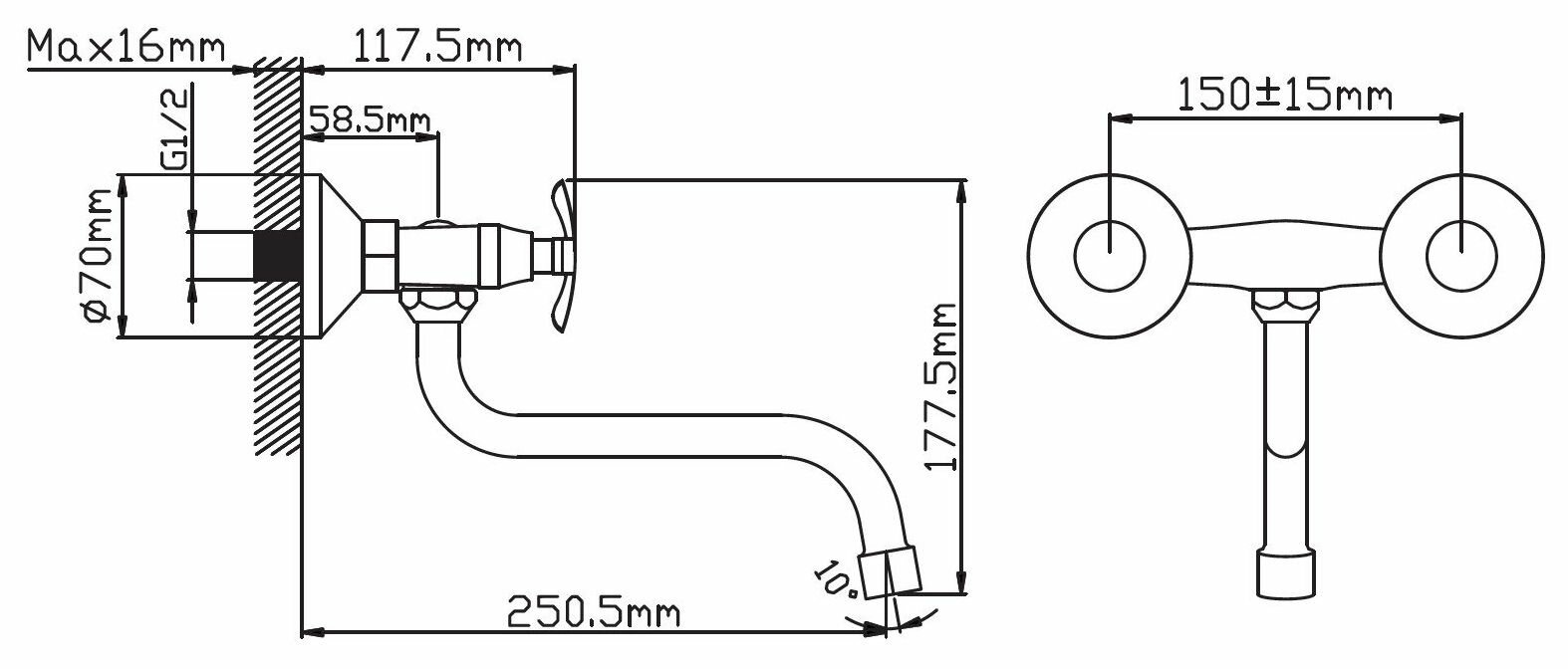 Настенный смеситель для кухни над раковиной двухвентильный