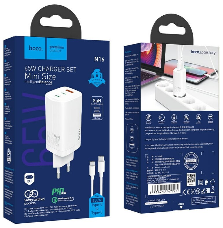 Сетевое зарядное устройство Hoco N16 Scenery 65W USB+2*USB-C + Кабель Type-C-Type-C, 4.8A, белое интересное: