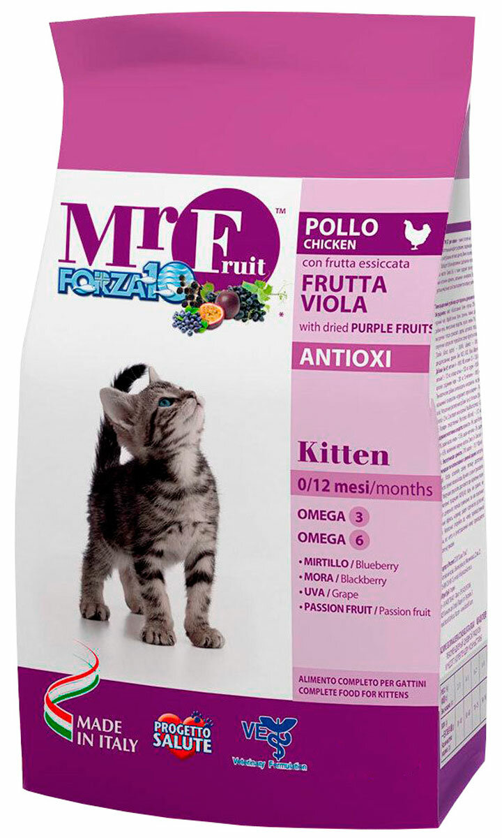 Сухой корм Forza10 Mr. Fruit Kitten Pollo Chicken, для котят с экстрактами фиолетовых фруктов и курицей, 12кг