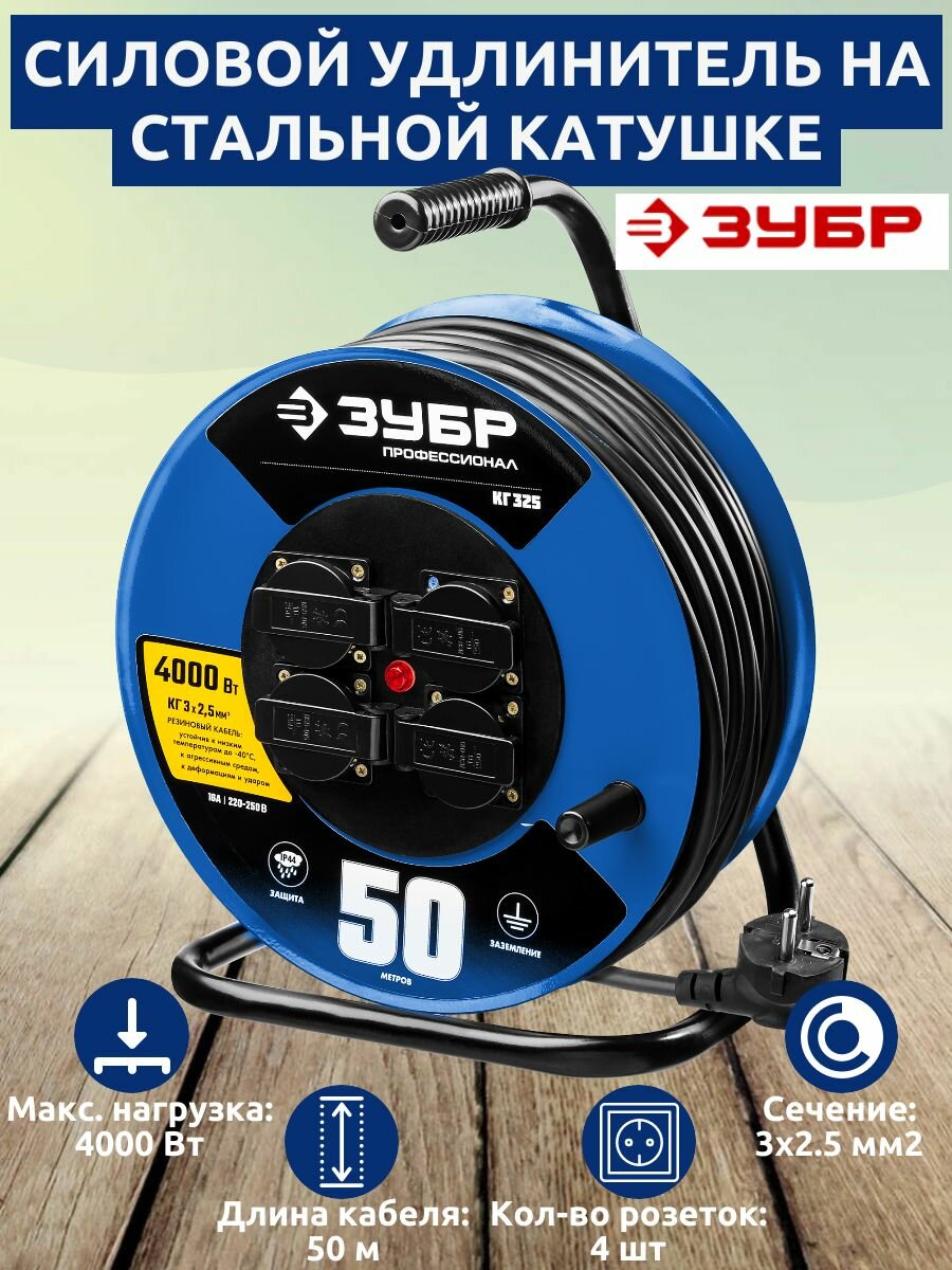 ЗУБР 55079-50 КГ 325 удлинитель на катушке, 50 м, 4000 Вт, 4 гнезда, IP44, КГ 3х2,5 кв мм, Профессионал