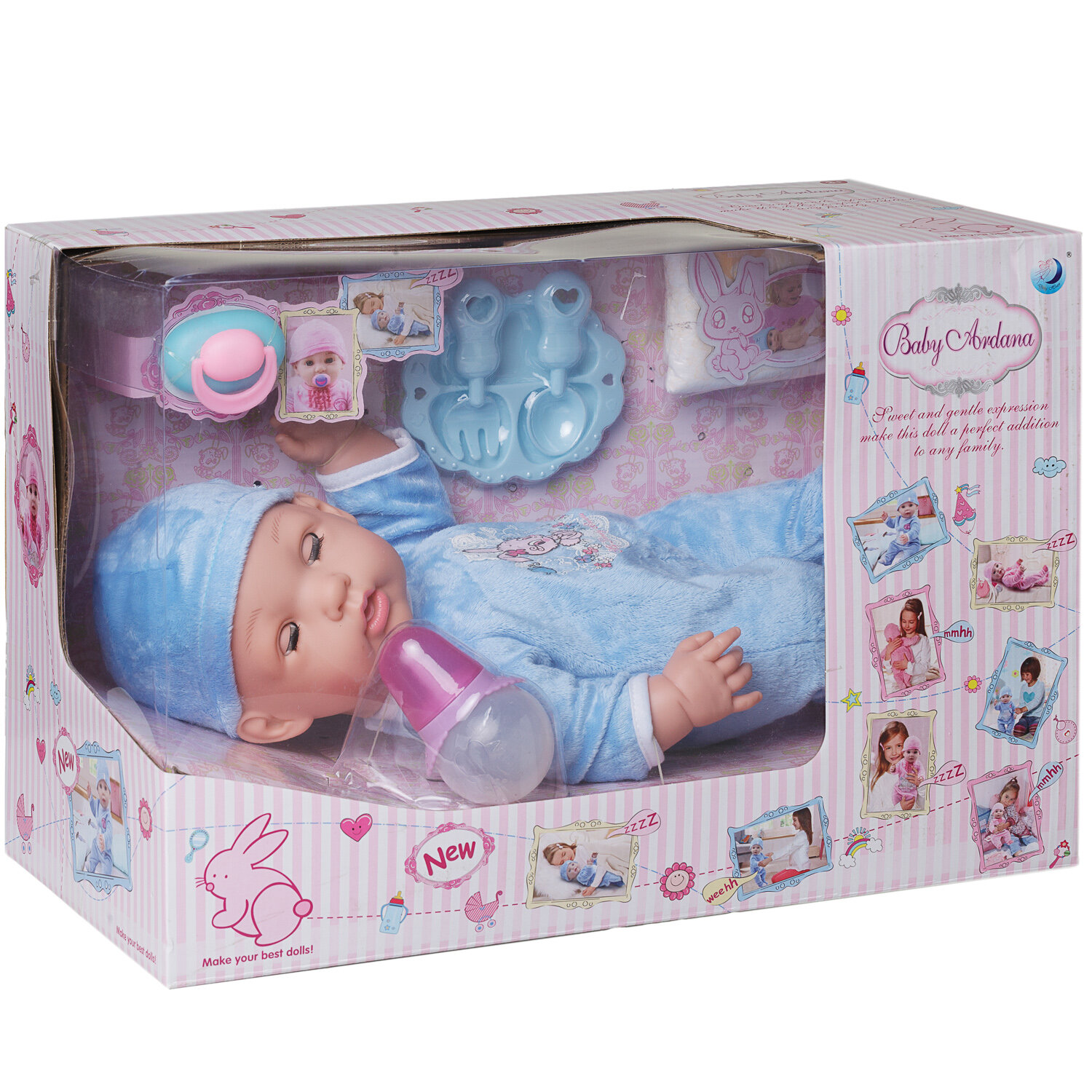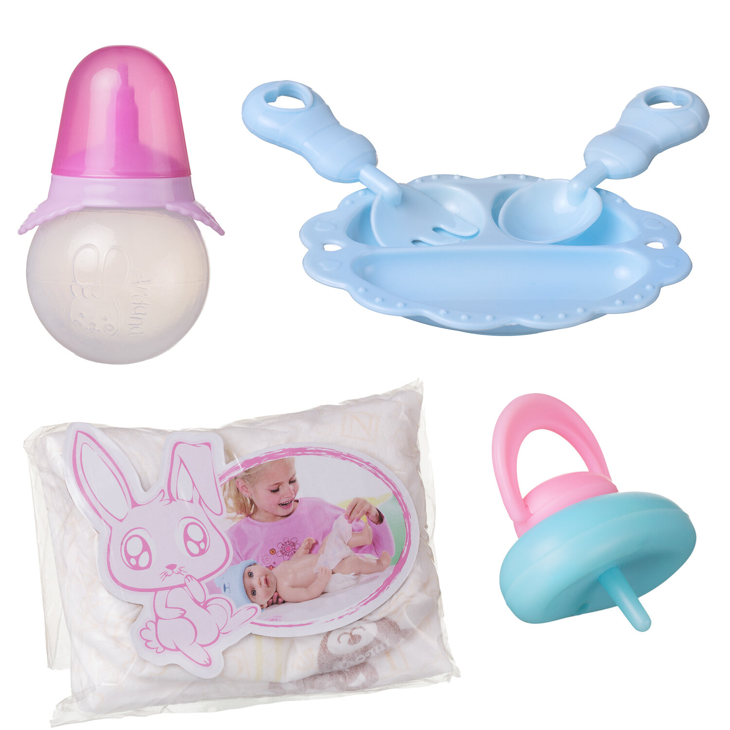 | Комплектация | пупс, бутылочка, соска, тарелка, столовые приборы |