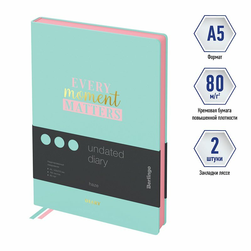 Ежедневник недатированный Berlingo А5, 160 листов, Haze, розовый срез, мятный, с рисунком UD2_95502
