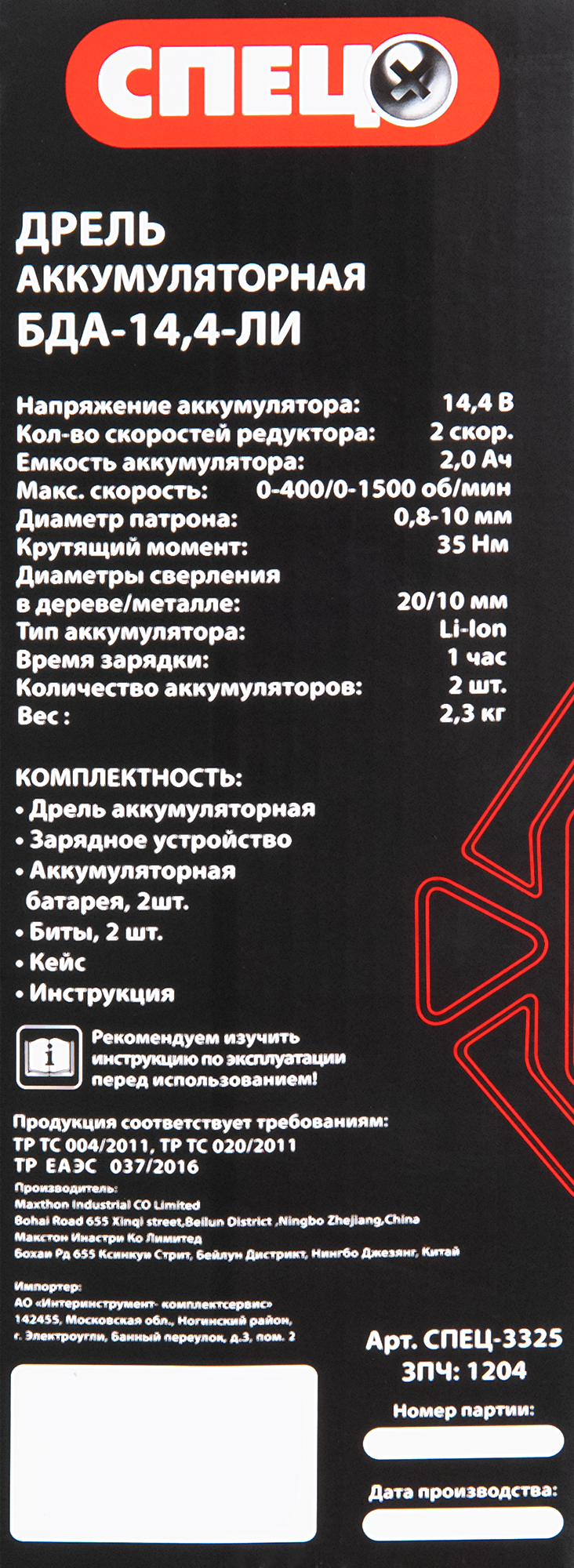Дрель-шуруповерт аккумуляторная Спец БДА-14.4ЛИ, 14 В Li-ion 2x2 Ач интересное: