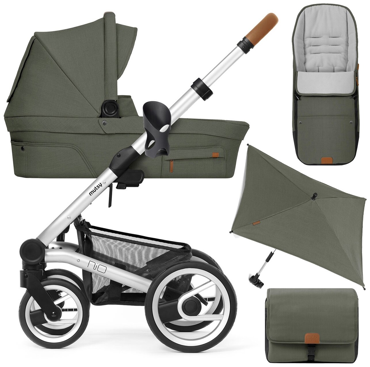 Коляска 2в1 Mutsy Nio Adventure Pine Green/Cognac grip black в комплекте сумка, конверт, зонт, подстаканник