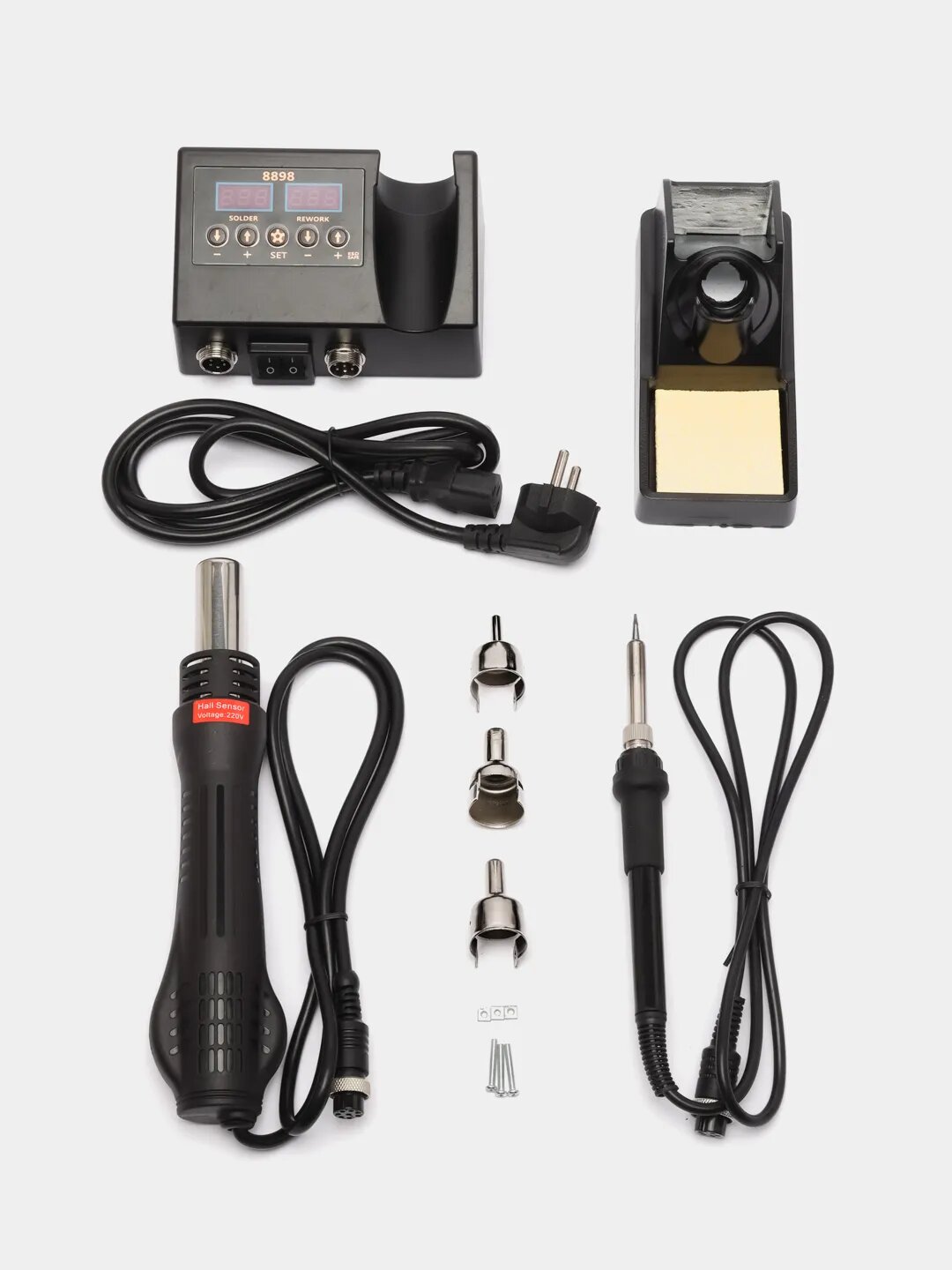 | Комплектация | Паяльная станция, Подставка под паяльник ,Паяльник ,фен ,3 насадки на фен |