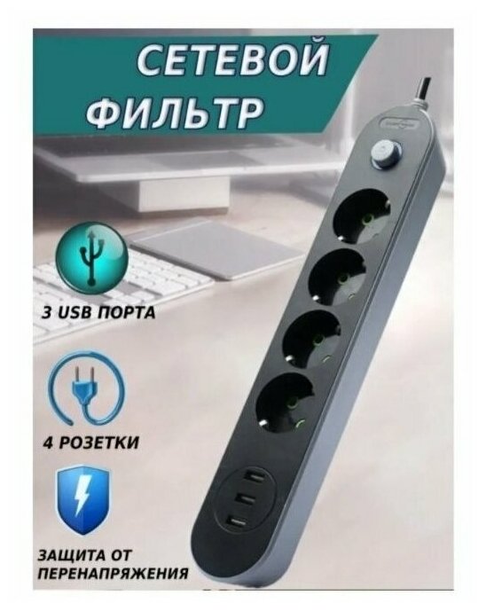 Сетевой фильтр CX-E104 2 м 4 розетки+3 х USB/Сетевой удлинитель/Сетевой тройник с переключателем на 4 розетки и 3 входа для USB. интересное: