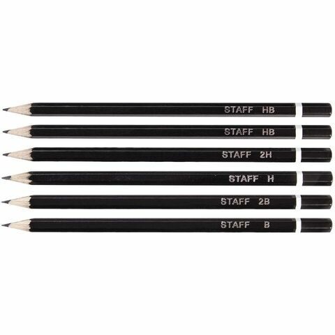 Карандаши чернографитные Staff 2H-2B, набор 6 штук, черный корпус, без резинки, заточенные (181254)