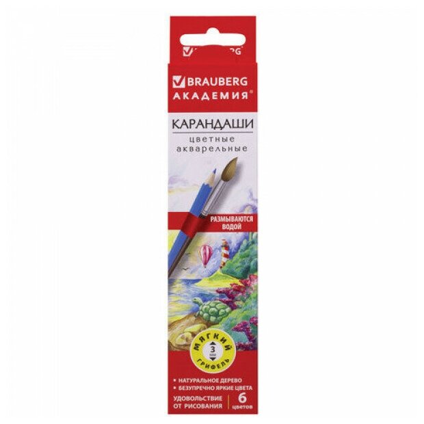 Карандаши цветные Brauberg акварельные "Академия", 6 цветов, шестигранные (181397)