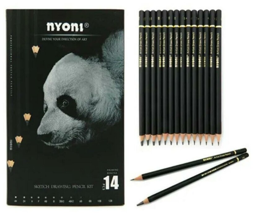 Набор деревянных чернографитных карандашей Nyoni 14 штук, 12 видов мягкости (4H, 2H, H, F, HB, B, 2B, 4B, 6B, 8B, 10B, 12B) интересное: