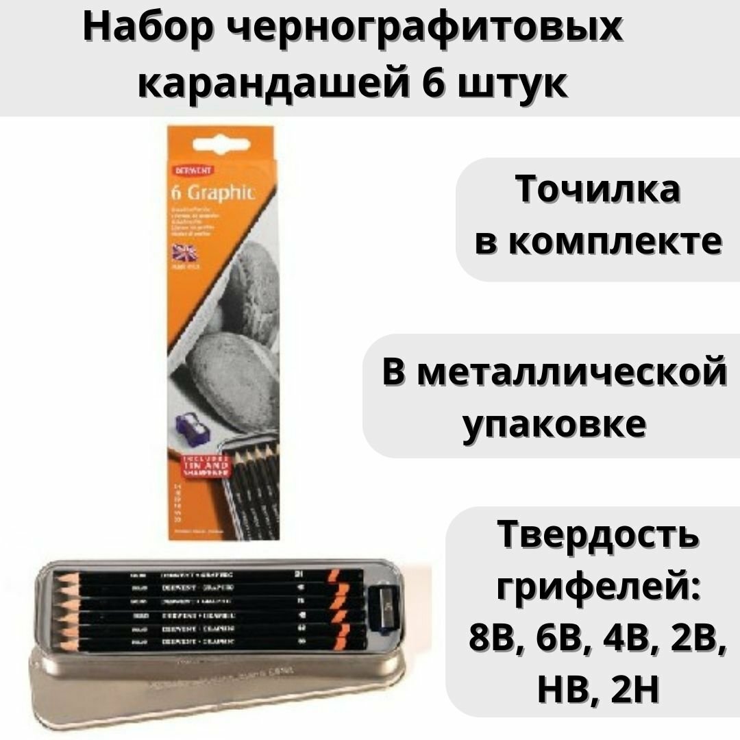 Набор чернографитовых карандашей Derwent Graphic 6 шт. с точилкой в металлической упаковке интересное:
