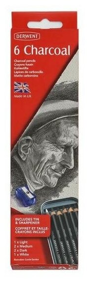 Набор угольных карандашей Charcoal 6шт с точилкой в металлической упаковке Derwent 0700838