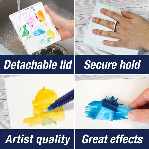 | Подробная комплектация | 24 кюветы с акварелью, съёмная палитра для смешивания, губка, кисть "Water Brush" с резервуаром для воды |