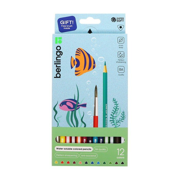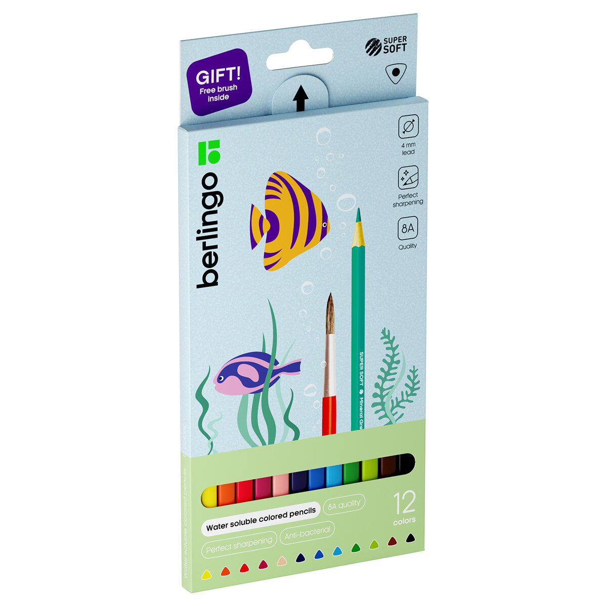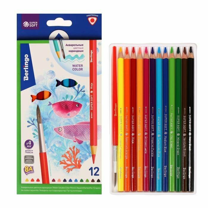 Купить Карандаши акварельные Berlingo "SuperSoft. Рыбки", 12цв.+кисть, трехгран., заточен., картон, европодвес