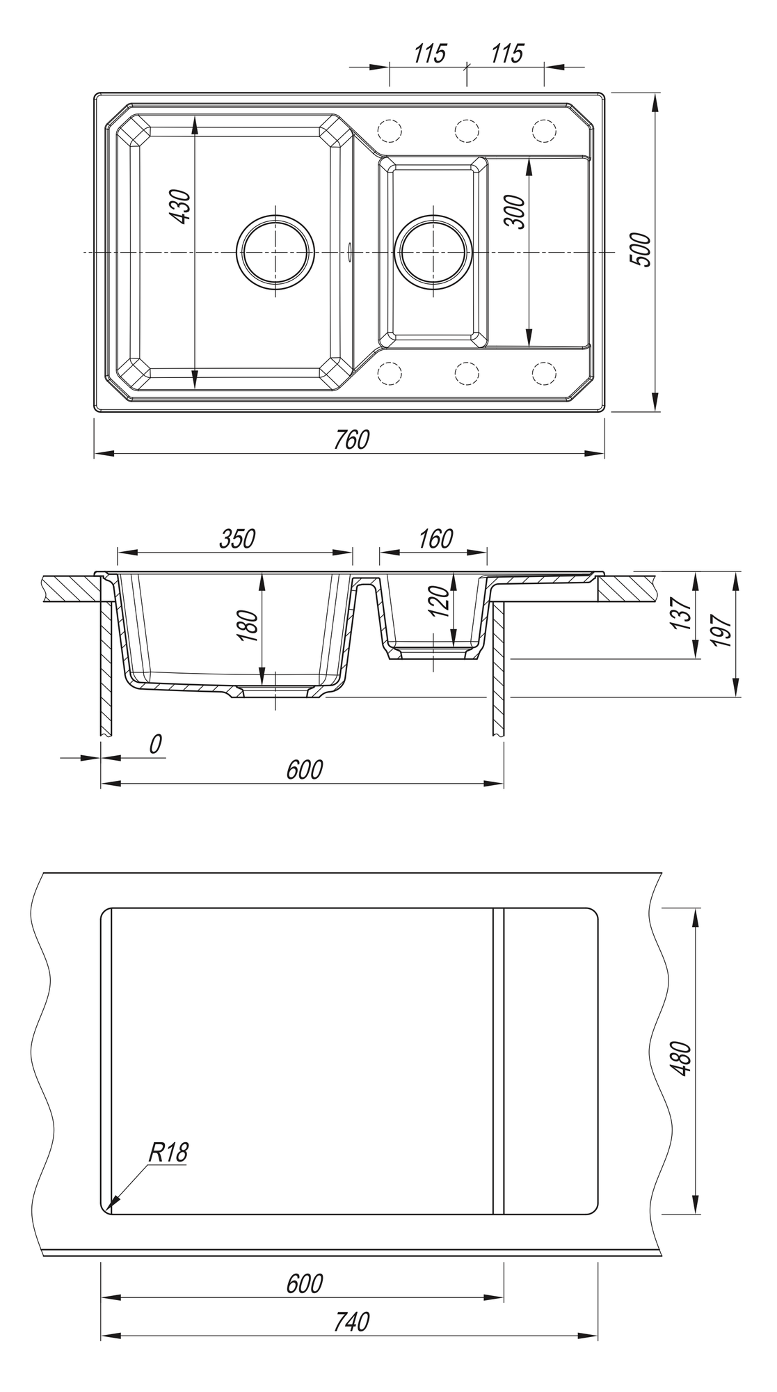 Врезная кухонная мойка KAISER KSS-7850R 78х50см нержавеющая сталь