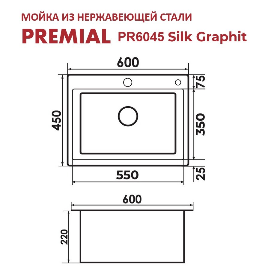 Кухонная мойка Premial PR 6045 (600*450) 3мм Silk Graphit интересное: