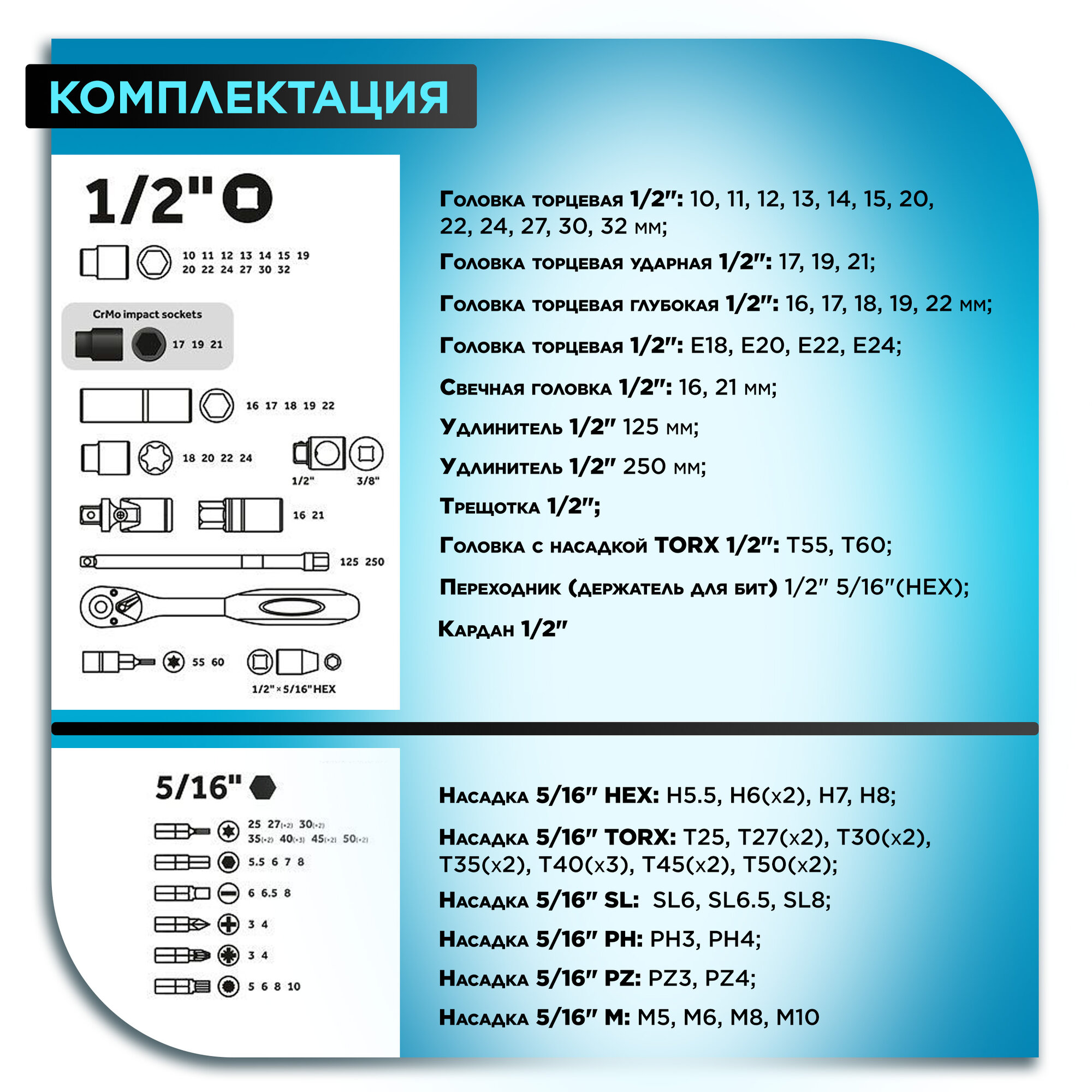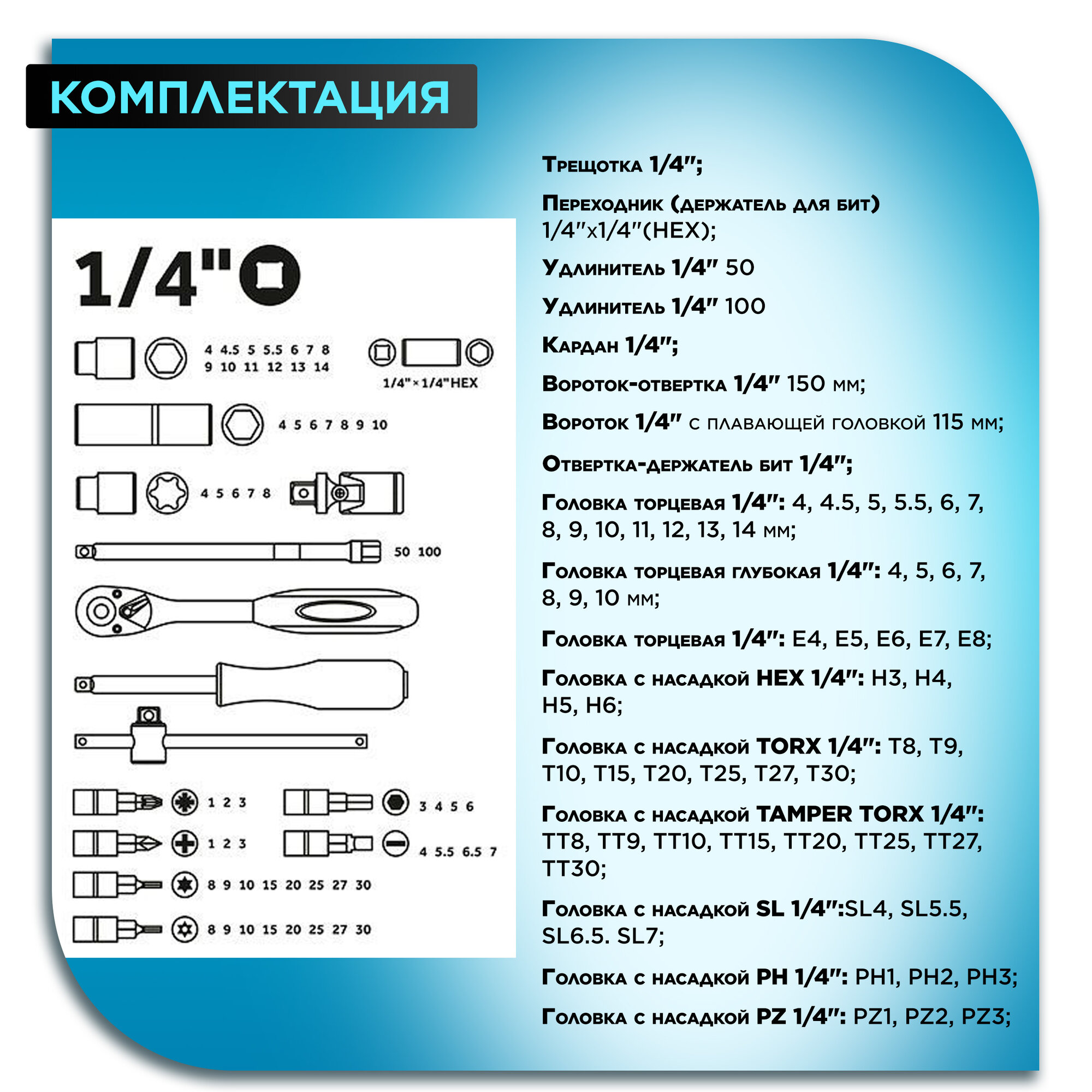 | Дополнительная информация | удлинитель 1/4" (2 шт.): 50 мм, 100 мм; удлинитель 1/2" (2 шт.): 120 мм, 250 мм; гибкий удлинитель 1/4" (1 шт.); переходники (2 шт.): 1/2" х 3/8", 1/4" х 1/4" Hex; адаптер для бит (1 шт.): 1/2" х 5/16 Hex; кардан 1/2" (1 шт), 1/4" (1 шт); вороток T-образный 1/4" (1 шт); трещотка 1/2" (1 шт), 1/4" (1 шт); Отвертки отвертка-вороток (1 шт: 1/4"); отвертка-вороток 1/4" |