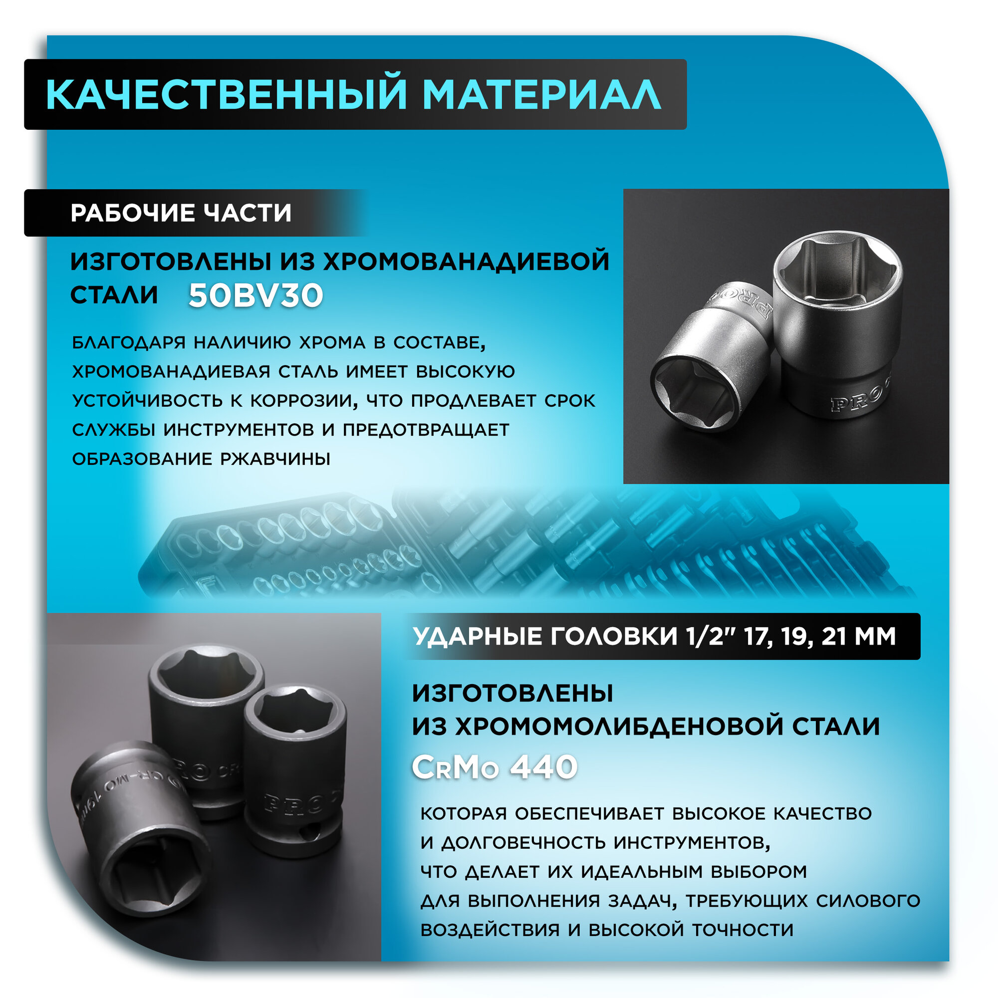 | Головки торцевые подробно | 1/2": 14-16,18, 20, 24, 27, 30, 32 мм; 1/4": 4, 4.5, 5, 5.5, 6-14 мм; ударные 1/2": 17, 19, 21 мм; свечные 1/2": 16, 21 мм |