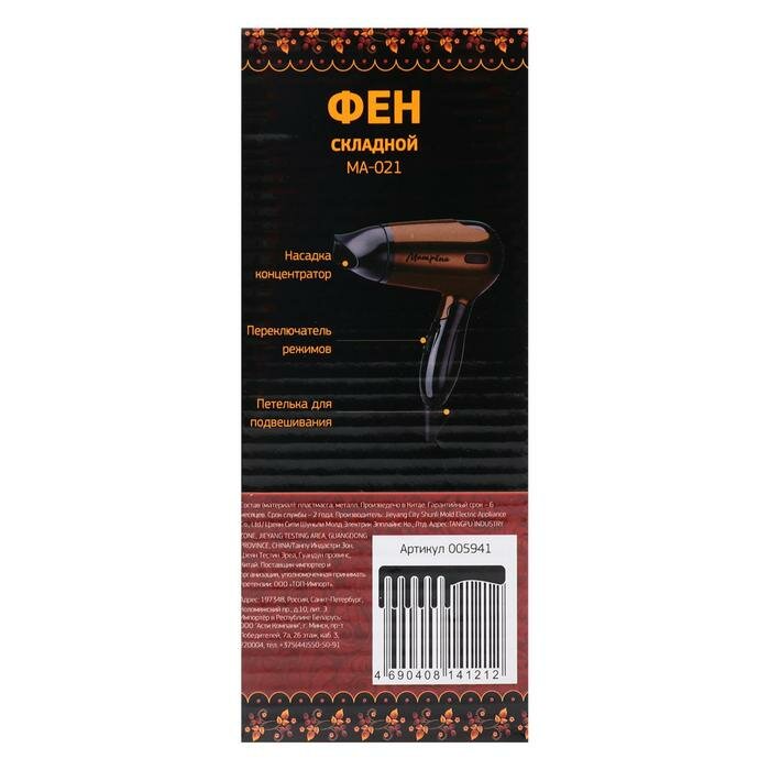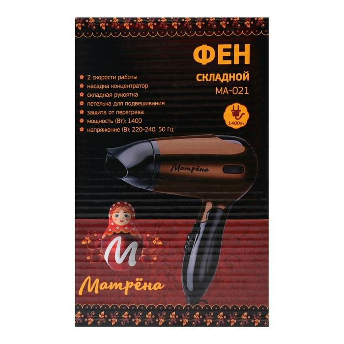 Фен "матрёна" MA-021, 1400 Вт, 2 скорости, 2 температурных режима, складная ручка, бежевый интересное: