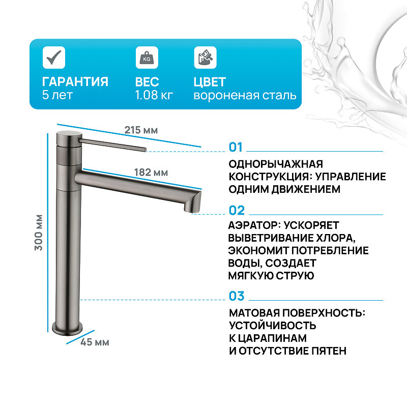 Смеситель KAISER Vita 43111-15 для раковины, высокий, воронёная сталь