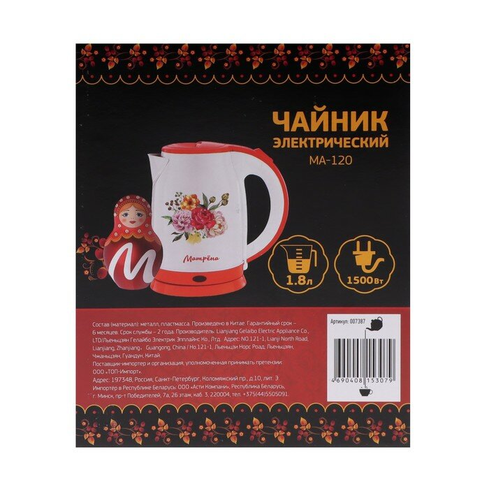 Ниже Вы можете прочитать отзывы на Чайник электрический матрёна MA-120, металл, 1.8 л, 1500 Вт, бело-зелёный с рисунком, ознакомится с подробными характеристиками, посмотреть интересные обзоры и фотографии на Чайник электрический матрёна MA-120, металл, 1.8 л, 1500 Вт, бело-зелёный с рисунком.