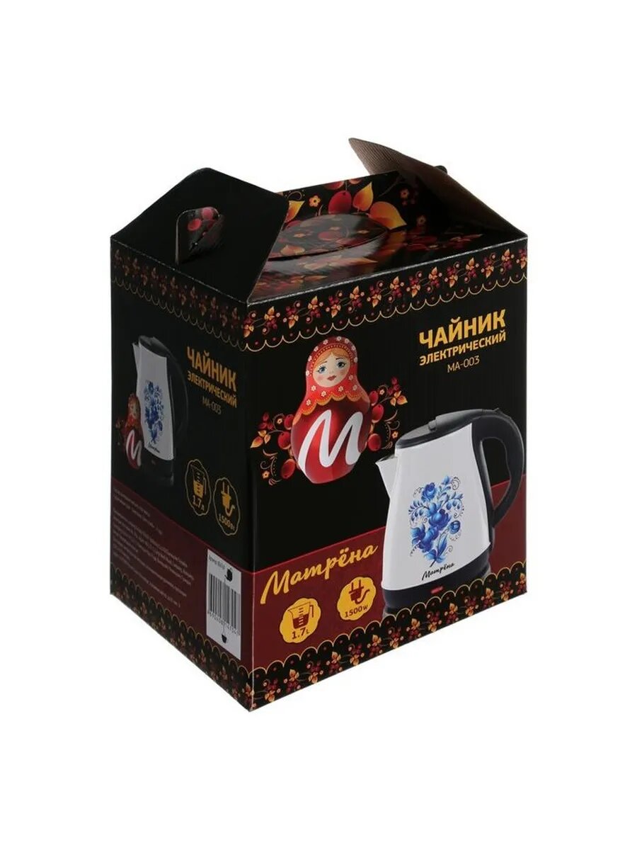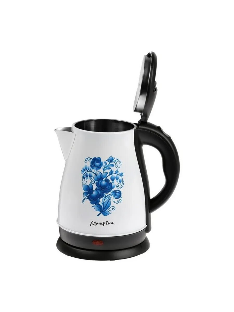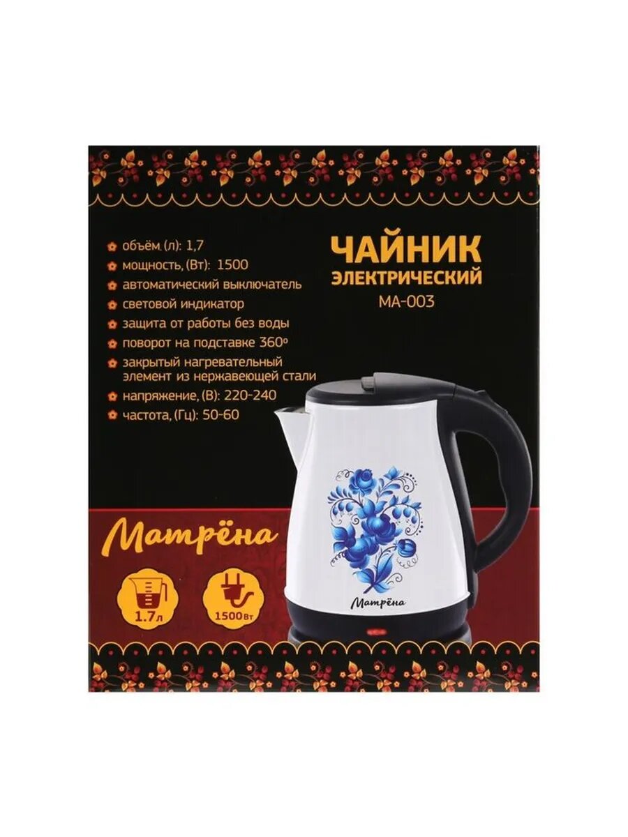 Чайник электрический"Матрёна" Ma-003, металл, 1.7 л, 1500 Вт, бело-чёрный с рисунком"Гжель" 936489 М интересное: