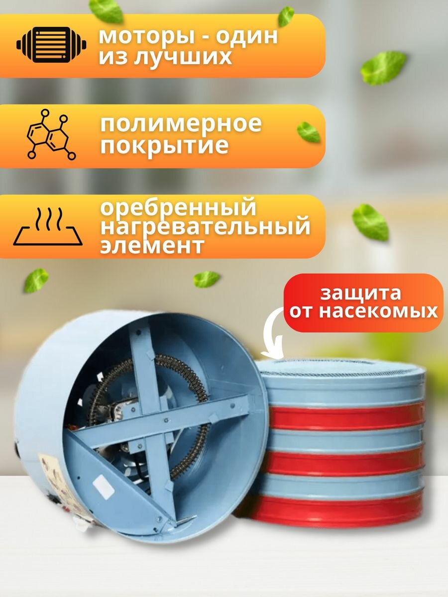 | Плюсы: | Большой объем, сравнительно быстро сушит, можно параллельно использовать как обогреватель. Сушу продукты и подогреваю в прохладные дни первый этаж дачи и частично второй. |
