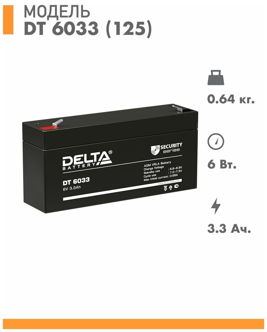 Аккумулятор DELTA DT-6033-125 (6В, 3.3Ач / 6V, 3.3Ah / вывод F1) Для слаботочных систем