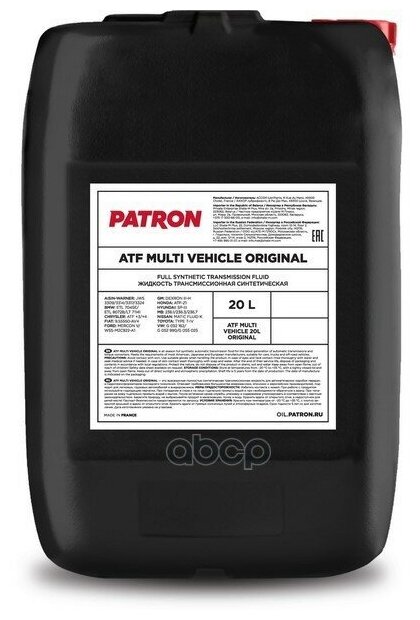 Жидкость гидравлическая 20л - JWS 3309/3314/3317, ETL 7045E/ETL 8072B/LT 71141, ATF+4, MERCON V,DEXRON III-H, SP-III, MB 236.1/236.3/236.7, TYPE T-IV, G052162/G052990/G055025 PATRON ATF MULTI VEHICLE 20L ORIGINAL | цена за 1 шт