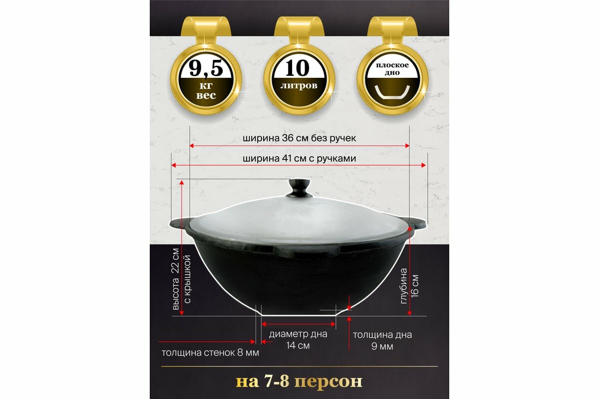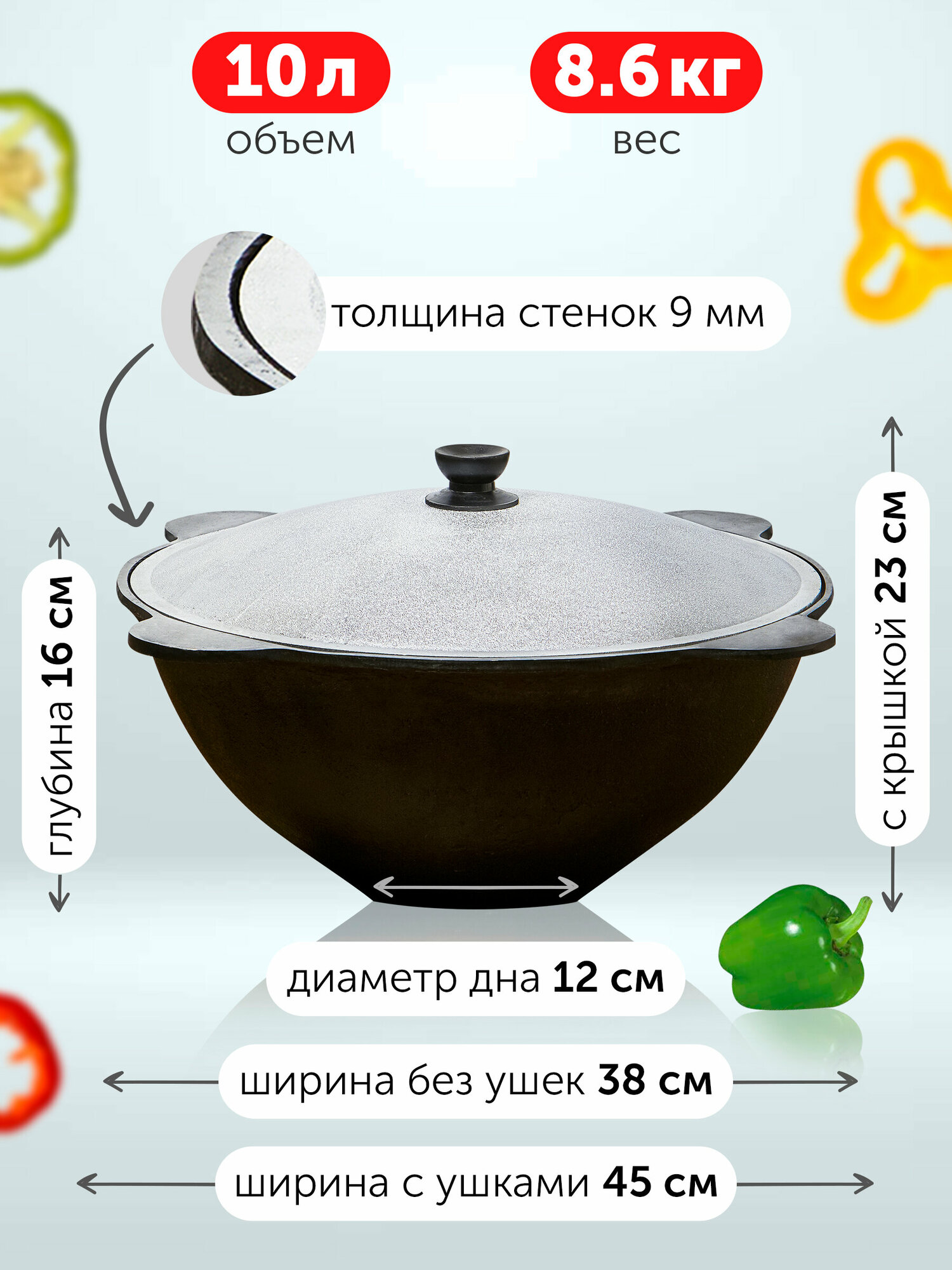 Казан чугунный Наманган Узбекский (плоское дно) с алюминиевой крышкой, с шумовкой, половником и специями, черный, 10 л