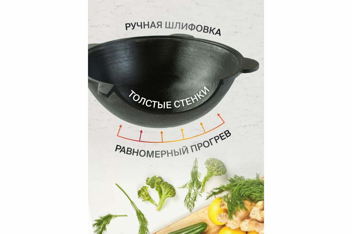 Казан чугунный Наманган Узбекский (плоское дно) с алюминиевой крышкой, с шумовкой, половником и специями, черный, 6 л