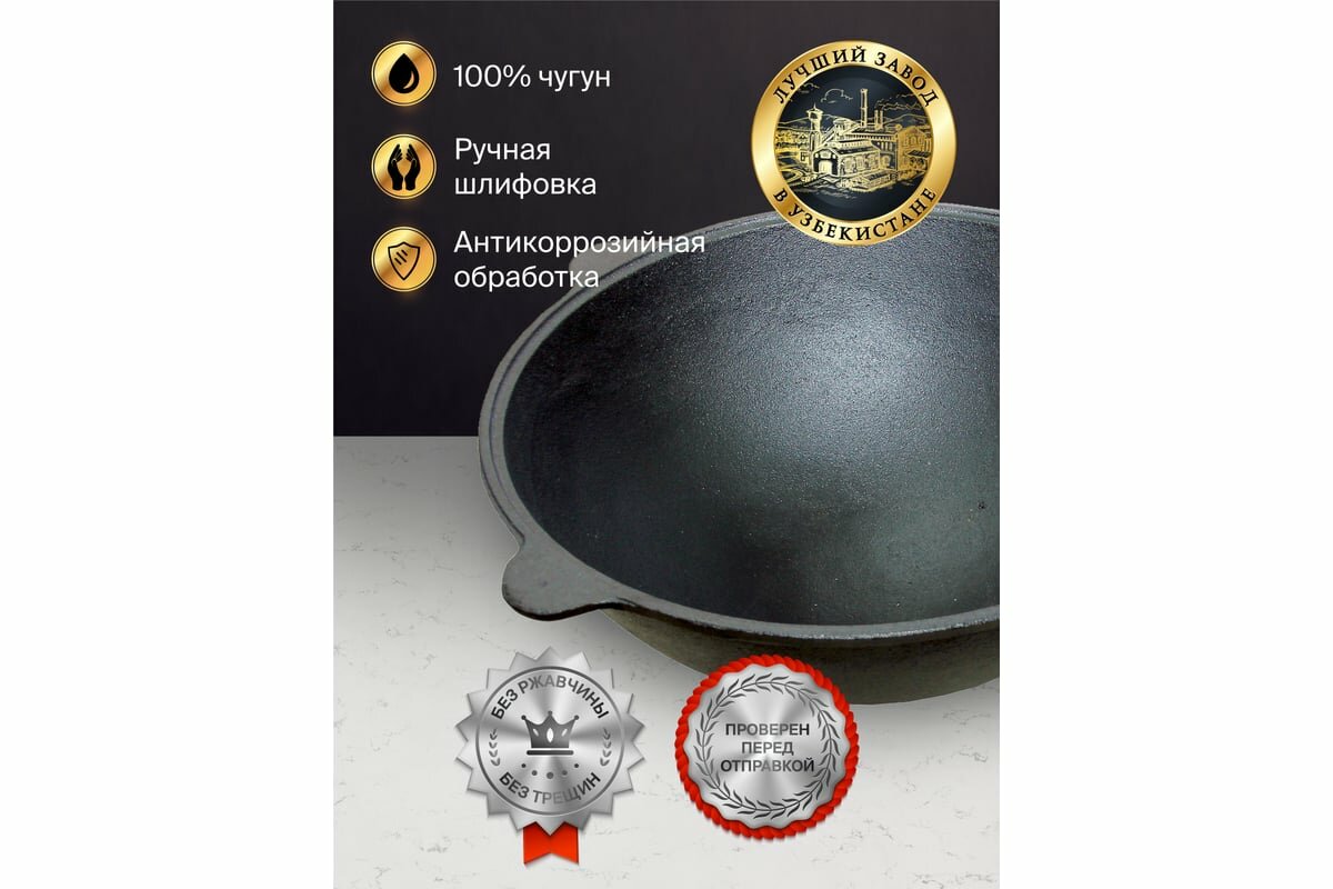 Казан чугунный Наманган Узбекский (плоское дно) с алюминиевой крышкой, с шумовкой, половником и специями, черный, 8 л