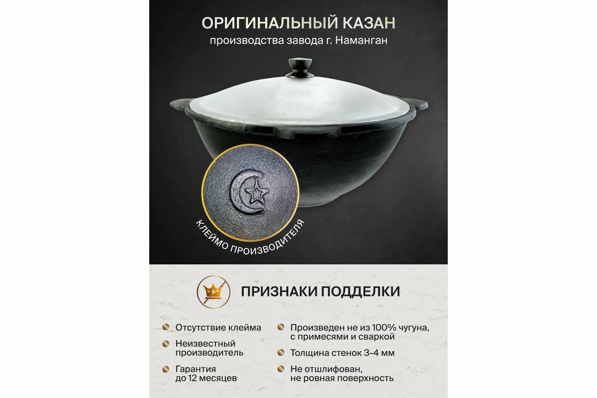 | Плюсы: | Настоящий узбекский казан есть оттиск полумесяц с звездой и маркировка 12 л. Чугун толстый с наружи как и положено в саже. В нутри отполирован и смазан, инструкция по подготовке прилагается. Половник и шумовка из полстой нержавейки, на ручках арнамент. Смотрится красиво, кто думает брать или нет, не сомневайтесь берите, я сам долго выбирал. |