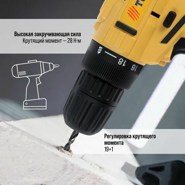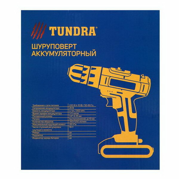Шуруповерт Tundra патрон БЗ, до 10 мм, LED, Li-ion, 1300 mAh, 20 V, 350-1250 об/мин, 28 Нм