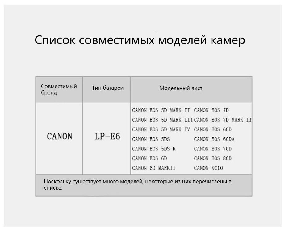 | Совместимый аккумулятор | LP-E6 / LP-E6N |