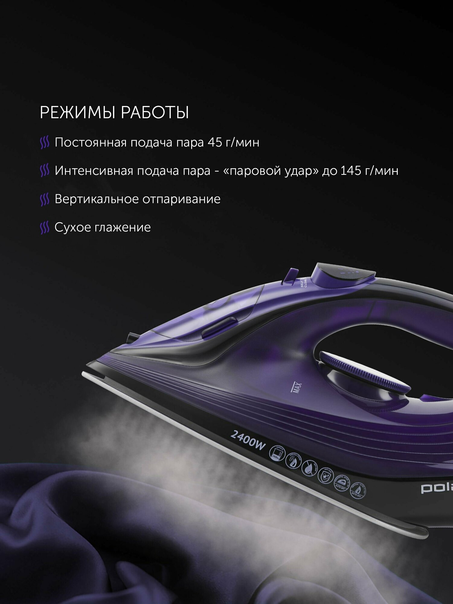 Мощный паровой удар Идеальное скольжение подошвы на всех типах ткани Авто отключение |