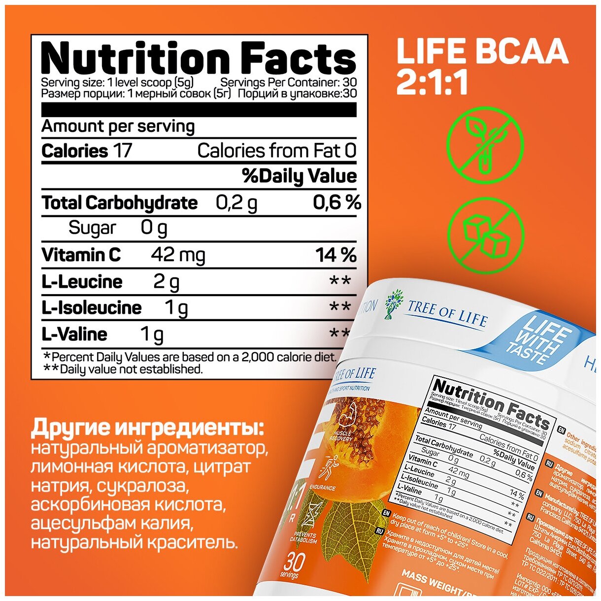 Аминокислотный комплекс бсаа + Витамин С Tree of Life bcaa 2:1:1 "Папайя",всаа порошок аминокислоты лейцин, изолейцин, валин, 150 гр., 30 порций
