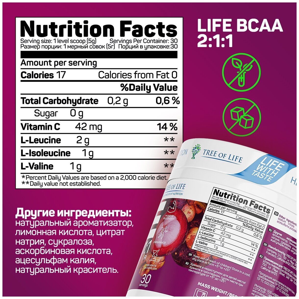 Аминокислотный комплекс бсаа + Витамин С Tree of Life bcaa 2:1:1 "Мангостин", всаа порошок аминокислоты лейцин, изолейцин, валин, 150 гр, 30 порций