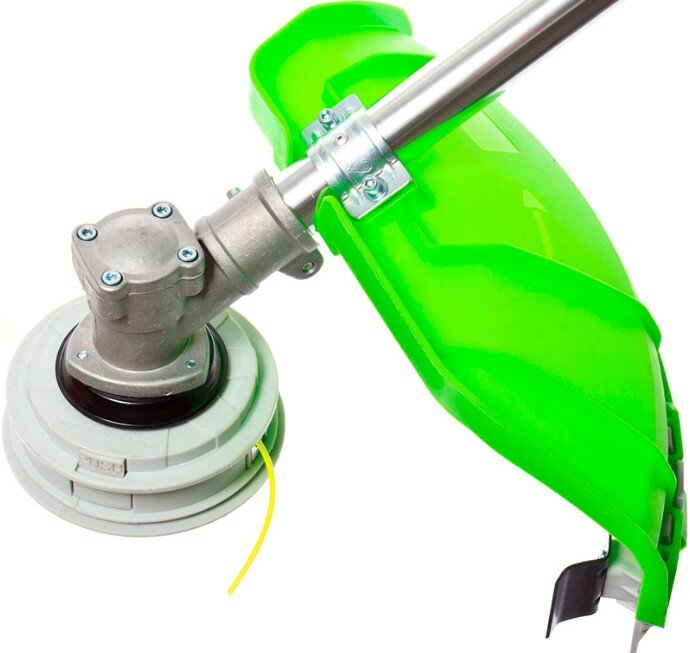 | Минусы: | Невозможно найти баланс косы, тянет вперед на катушку и руки обо рвешь при работе, есть ручка с отверстиями, но ее не хватает, чтобы вывесить косу по центру на скобе ремня. |