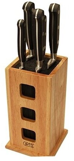 | Дополнительная информация | сталь 3cr13; тип подставки: закрытая; способ фиксации ножей: мягкий наполнитель |