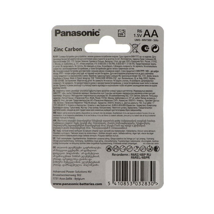 Panasonic Батарейка солевая Panasonic Zinc Carbon, AA, R6-4BL, 1.5В, блистер, 4 шт, интересное: