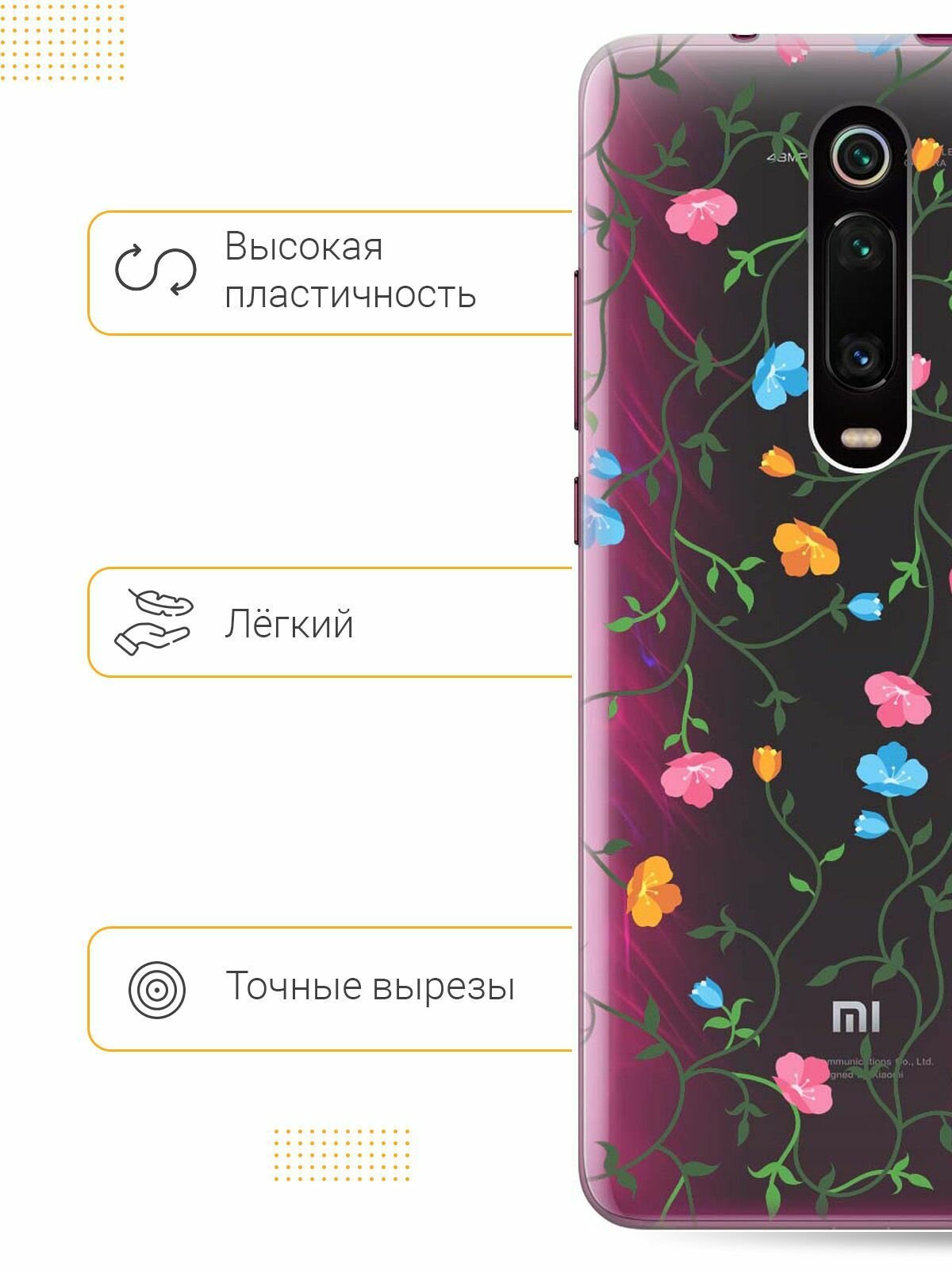 Ультратонкий силиконовый чехол-накладка Transparent для Xiaomi Mi 9T / Mi 9T Pro / K20 / K20 Pro с 3D принтом "Сurly Flowers" интересное: