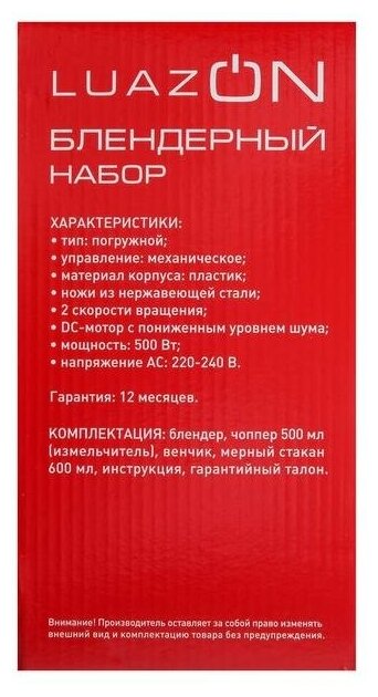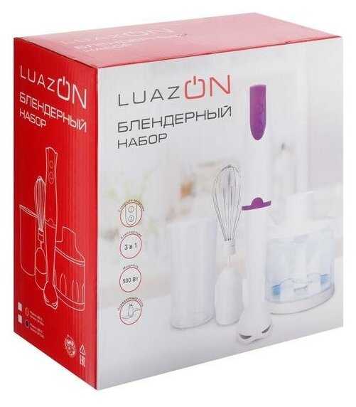 Блендер LuazON LBR-01, погружной, 500 Вт, 2 скорости, стакан 0.6 л, измельчитель, венчик 2813364 интересное: